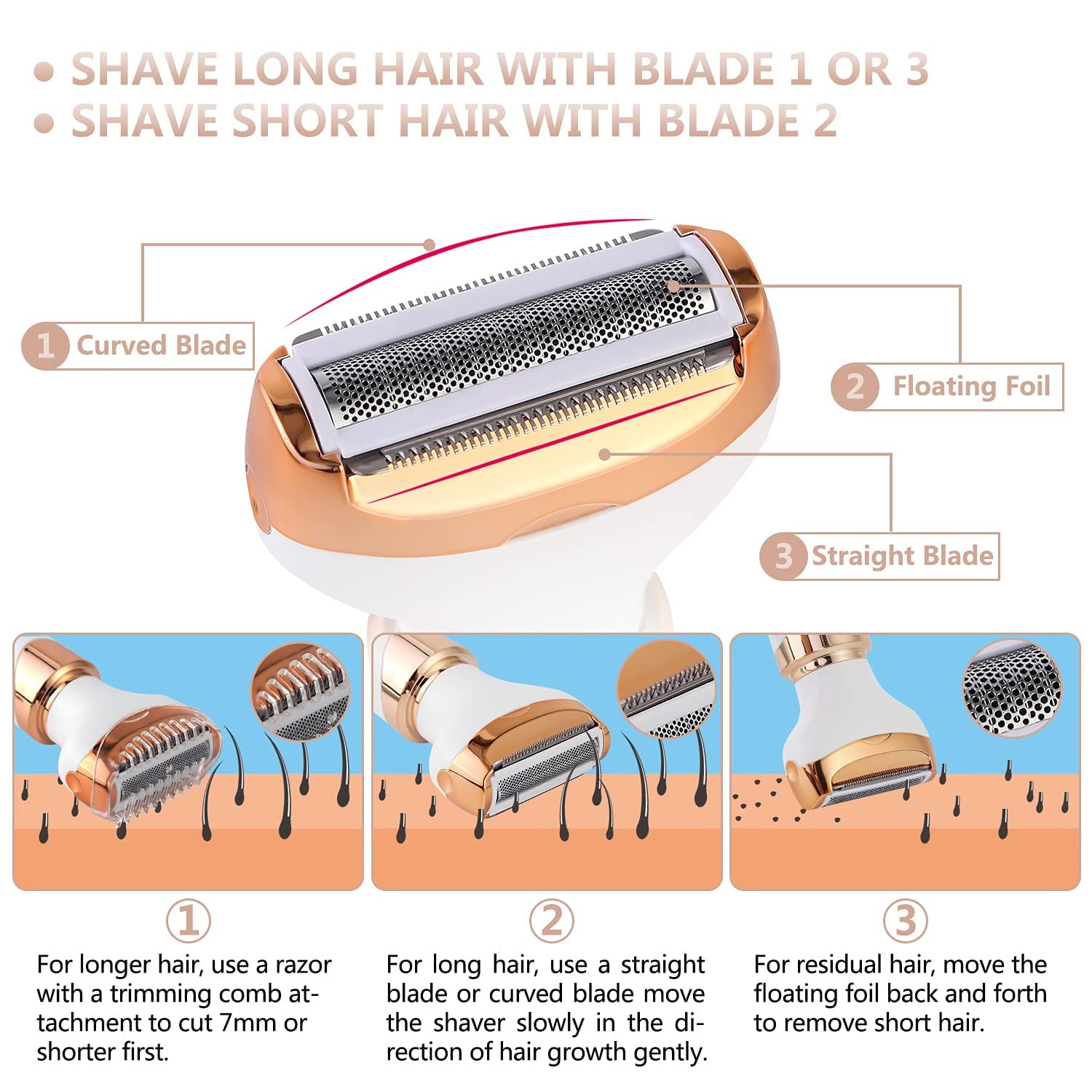 Our women electric razor contains 4 replaceable cutter heads, namely, eyebrow trimmer, nose hair trimmer, facial hair removal and bikini shaver. And other accessories includes cleaning brush, USB cable and manual. The 100% detachable stainless steel blade is easy to clean, providing you with a quickly shaving effect, which can fully meet your various personal care needs.